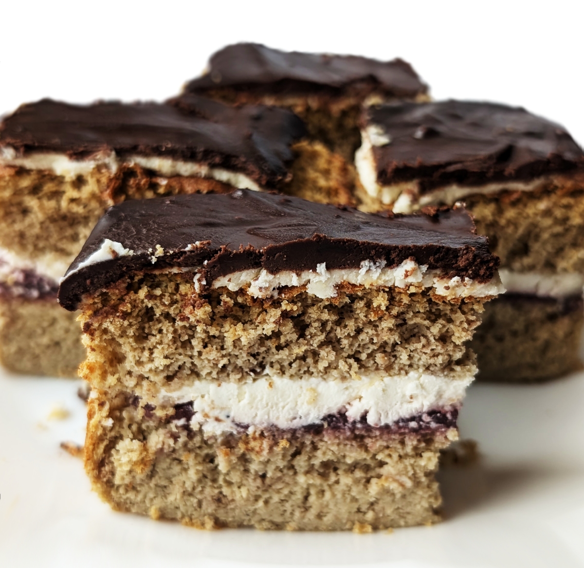 No dobra, prawie bex słodzików, bo dżem do przełożenia był ze stewią – nie miałam nic bez słodzenia – ale można użyć musu z owoców! Biszkopt na bazie tego, który już opracowałam z mąki kokosowej, ale tutaj opcja z musem z jabłek w środku. Dają sporo słodyczy – ale musi być bardzo słodka odmiana – u mnie lobo. Gdyby nie mascarpone i ten dżem to wolałabym nieco doszłodzić – chociaż ok. 20-30 g erytrytolu. Jednak da się to pominąć – jest i tak smaczne.
