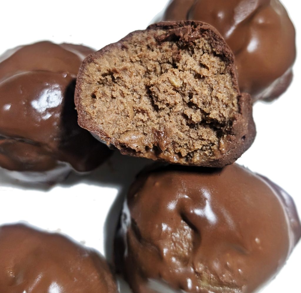 Po przestudzeniu ciasta próbowałam przełożyć, ale po przekrojeniu mi się rozwaliło, więc uformowałam kulki – wstawiłam do schłodzenia na chwilę – w tym czasie rozpuściłam czekoladę do polewy – mix ciemnej i mlecznej roztopionej w kąpieli wodnej z odrobiną oleju kokosowego do rozcieńczenia + doprawiłam szczyptą przyprawy korzennej i kropelkami karmelowymi.