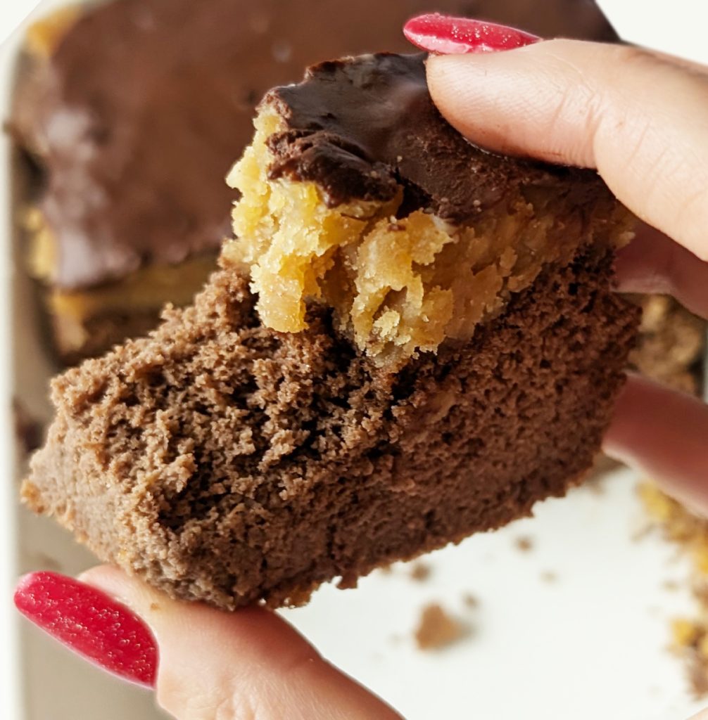 Polewa: rozpusczone masło (może być mleczko kokosowe) i masło orzechowe 1:1 i biała czekolada. Mniej więcej po 100 g. Trochę dużo wyszło 🙂